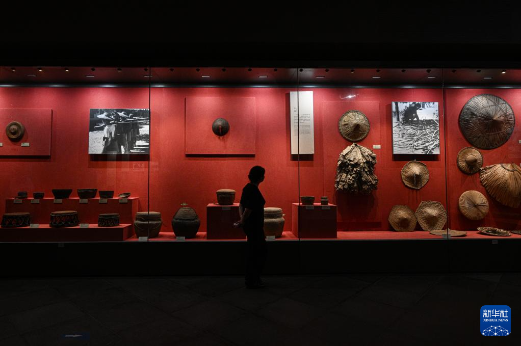 5月16日,游客在位于海南五指山的海南省民族博物馆观看黎族制陶工具。