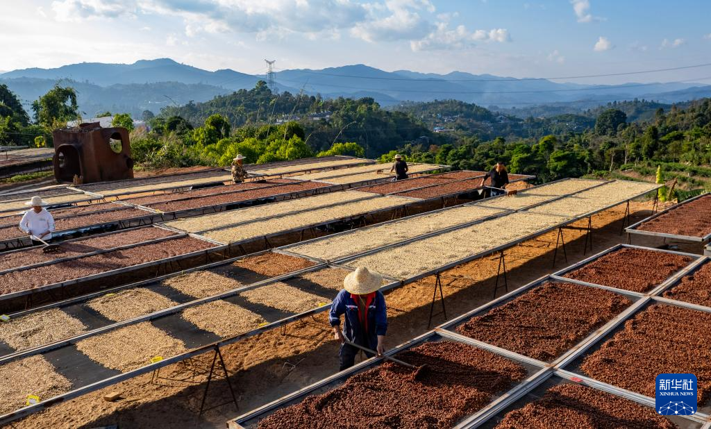 工作人员在云南省普洱市思茅区大开河梅子咖啡庄园的咖啡晒场翻晒咖啡(无人机照片,2025年1月7日摄)。