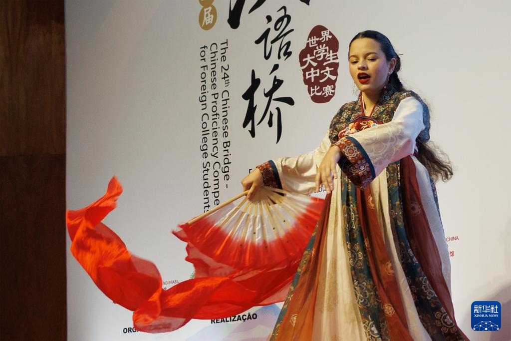 5月17日,在巴西里约热内卢,一名大学生参赛选手在比赛中进行才艺展示。