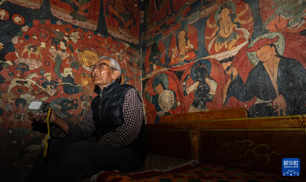 早上十点,仁增旺扎会从家出发,顺着400多级陡峭的台阶,几步一歇地爬上石窟。抵达后,他会先把石窟打扫干净,然后爬上爬下,重点检查几处有壁画的石窟内是否有渗水、坍塌等风险。有游客来参观时,他会给游客讲解石窟及壁画的悠久历史,也会提醒他们要注意保护壁画;送走游客,他总会细心关好每一扇石窟的门。忙碌间隙,他习惯坐在石窟前,喝点自带的酥油茶,嚼几口糌粑——这便是仁增旺扎二十余年如一日的守窟日常。