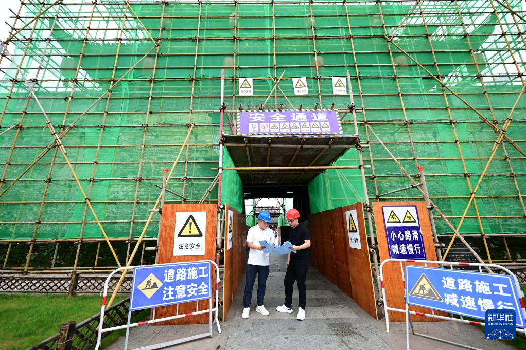 6月19日,周虎(右)在歙县徽州古城南谯楼保养维护工程现场查看。