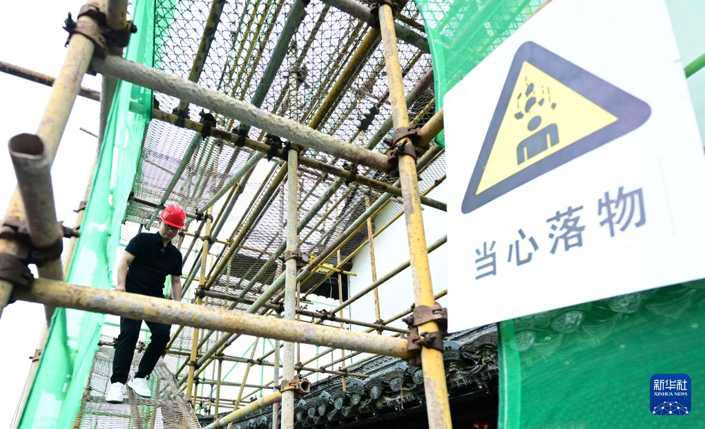 6月19日拍摄的歙县徽州古城南谯楼保养维护工程现场(无人机照片)。