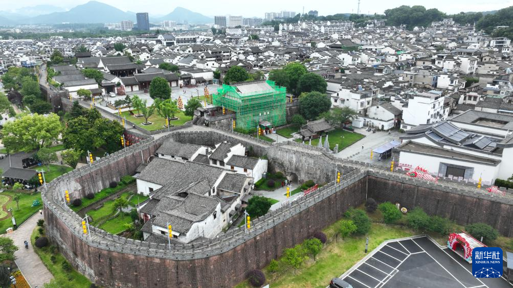 6月19日,周虎(左下)在歙县徽州古城南谯楼保养维护工程现场查看(无人机照片)。