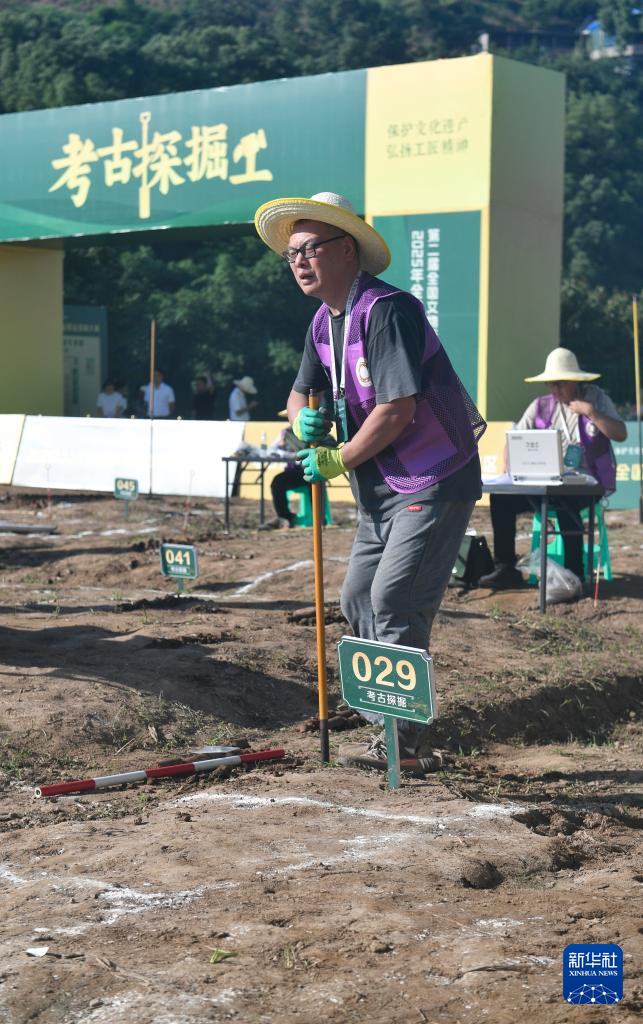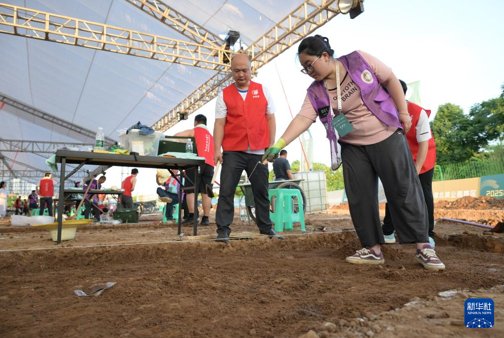 参赛选手在考古探掘工赛区进行考古发掘比赛(7月4日摄)。