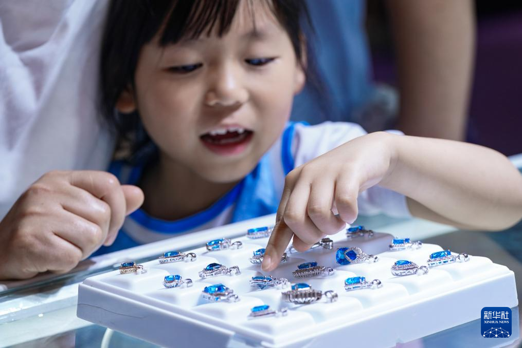7月10日,小朋友在昆明石博会上帮家长挑选玉石。