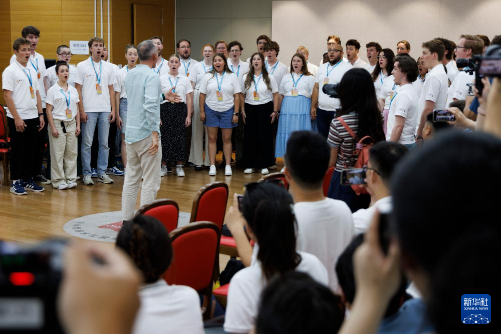 7月14日,在中国交响乐团,犹他谷大学合唱团、河北省正定中学合唱团等团员在观看乐团排练。