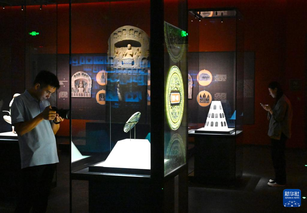 7月16日,参观者在汉魏洛阳故城遗址博物馆观看展品陶百花灯。