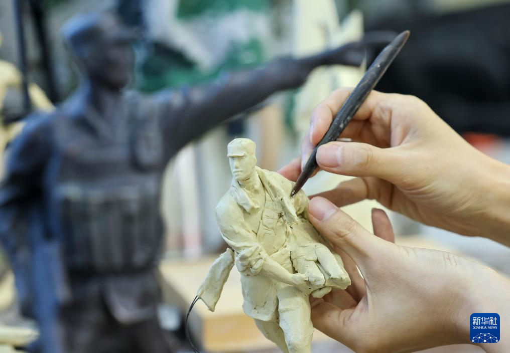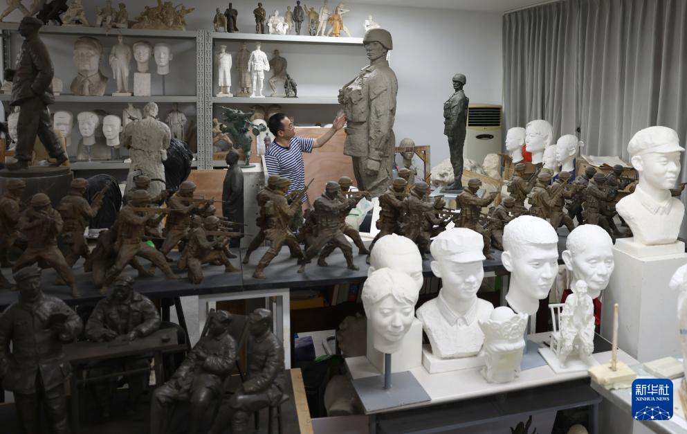 7月17日,解放军文工团雕塑创作员郎钺在擦拭雕塑。