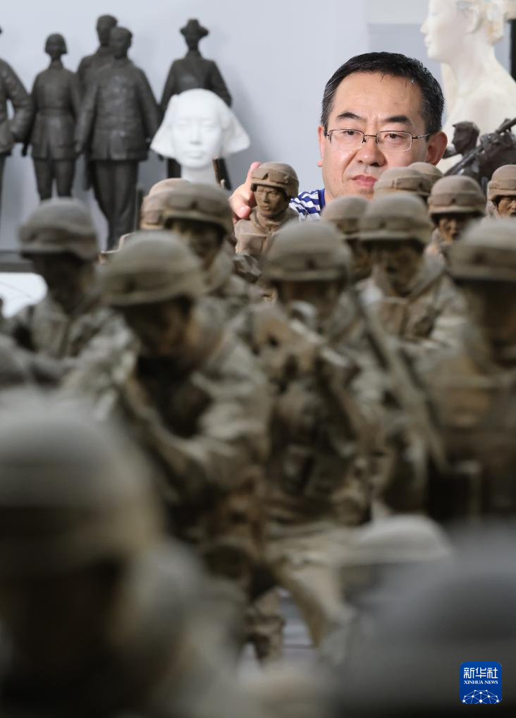 7月24日,国防大学军事文化学院副教授王树山在查看自己的雕塑作品。