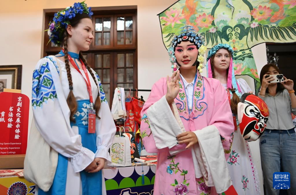 8月6日,上合国家青年学生在体验京剧艺术。