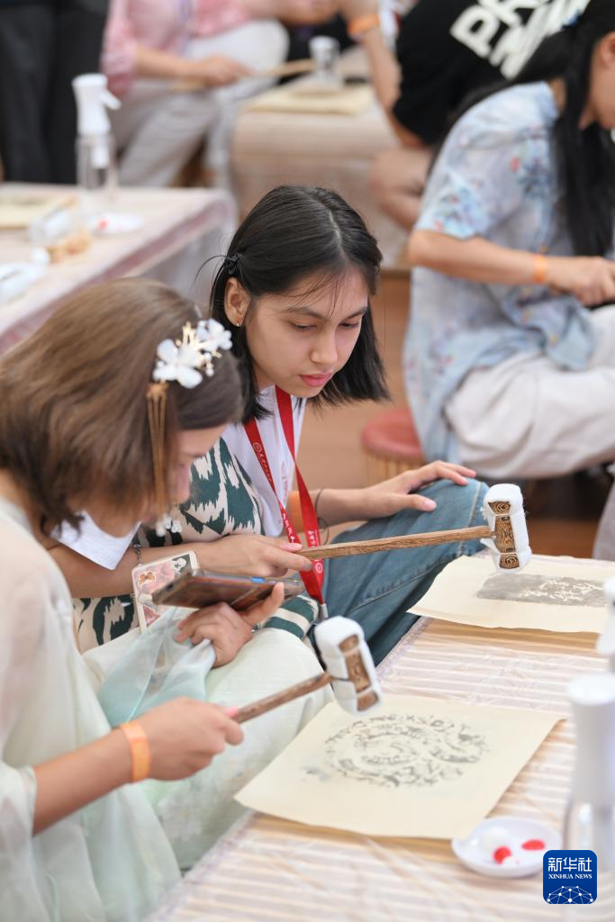 8月6日,上合国家青年学生在体验金石传拓技艺。