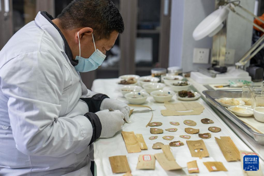 5月25日,布达拉宫贝叶经实验性修复小组实验室工作人员在对贝叶进行处理。