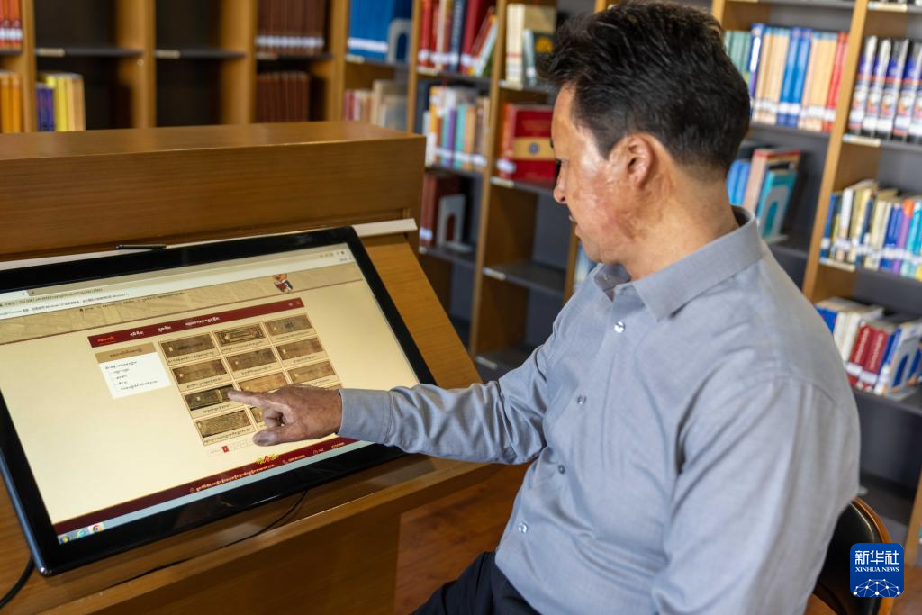西藏自治区图书馆副馆长边巴次仁介绍数据库中的藏文古籍(2025年8月13日摄)。新华社记者 旦增尼玛曲珠 摄