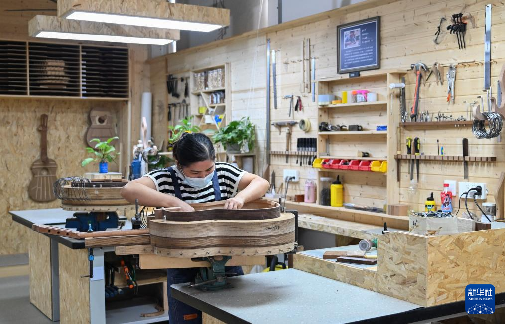 8月28日,在湖北省松滋市一家吉他企业生产车间,工人在制作吉他。