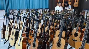 8月28日,参观者在湖北省松滋市一家吉他企业参观吉他成品。