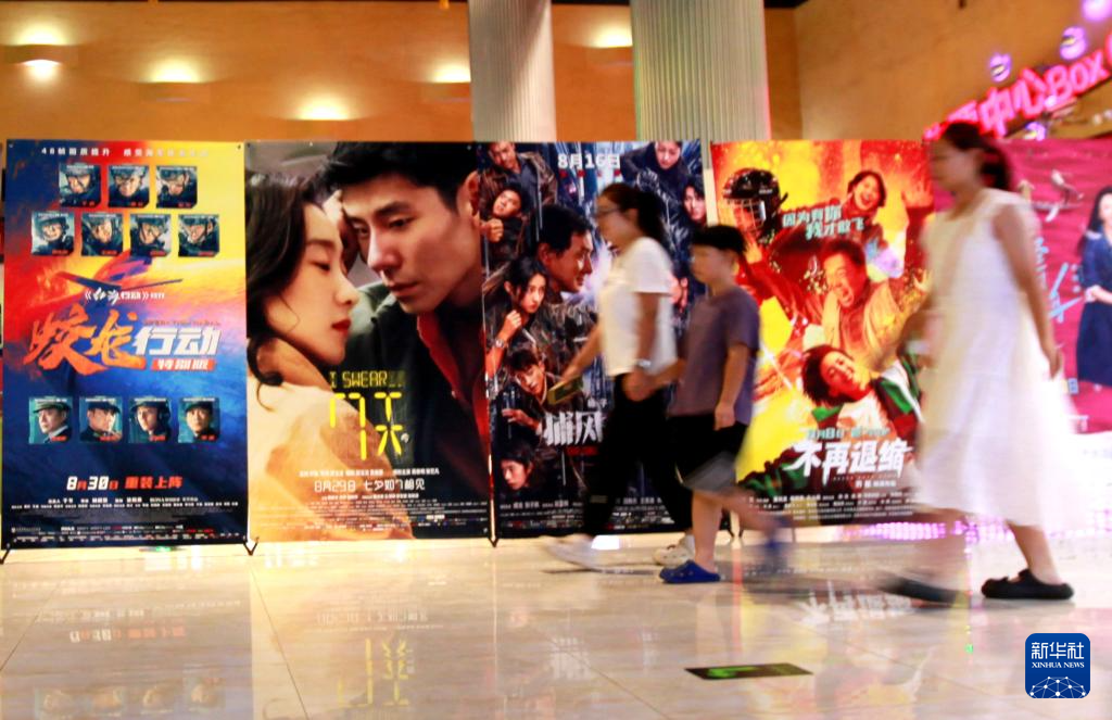 8月30日,在山东省临沂市平邑县时代国际影城,观众从电影宣传海报前走过。