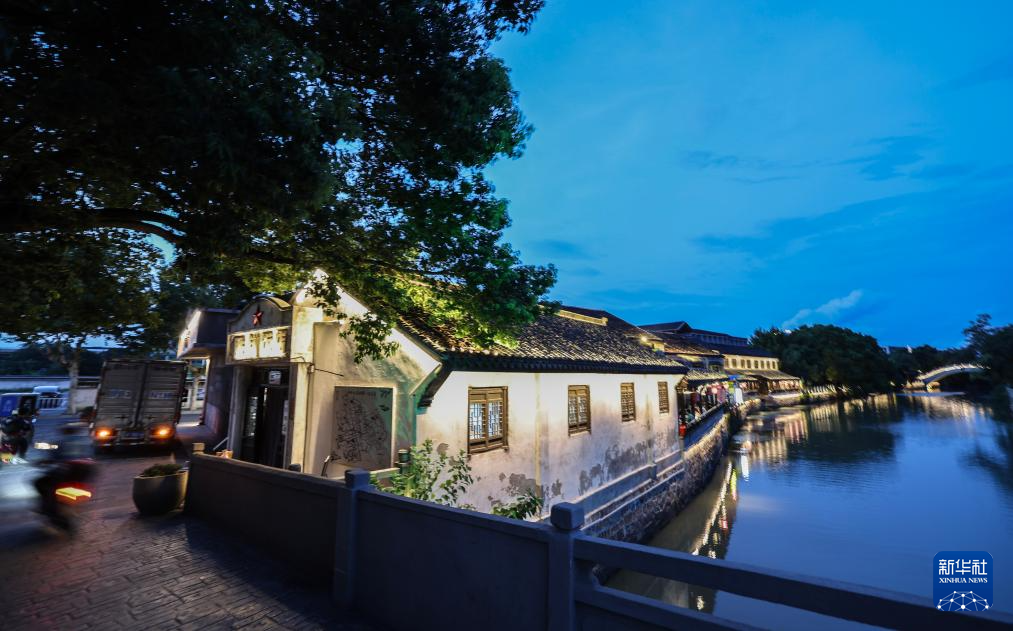 这是9月19日拍摄的夜色中的沈荡镇老街(无人机照片)。