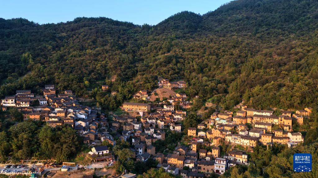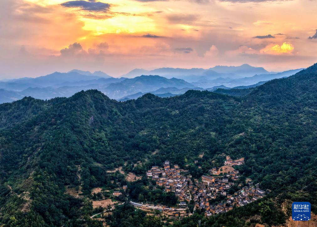 9月18日拍摄的夕阳照耀下的阳产村(无人机照片)。