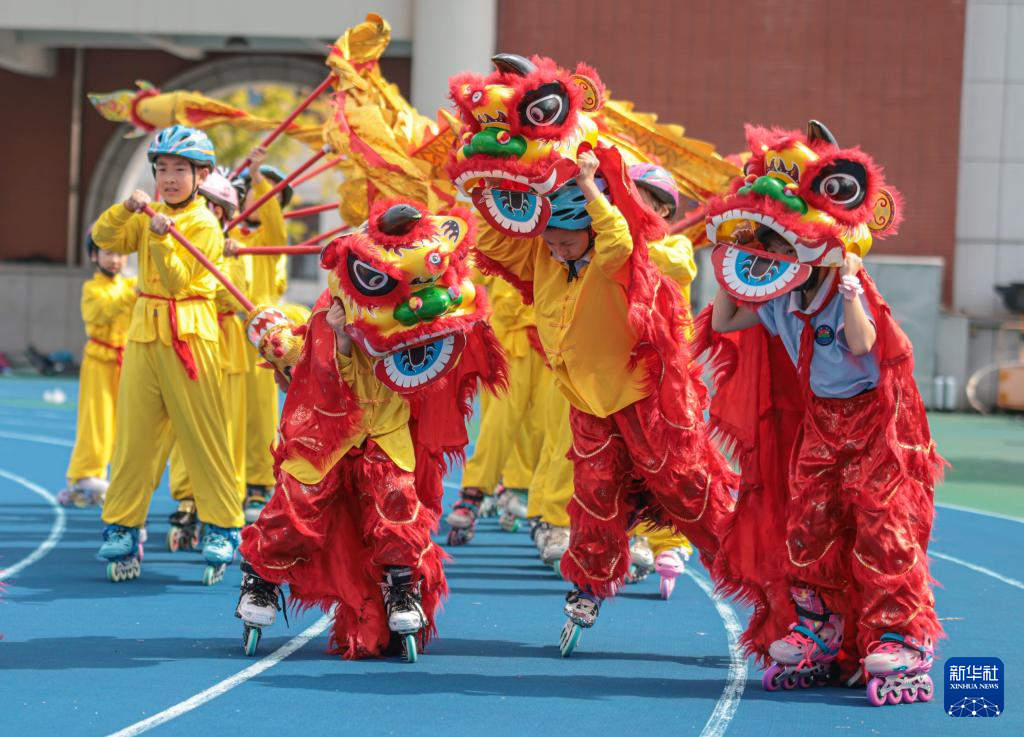 9月29日,在山东省荣成市实验小学,孩子们表演舞龙舞狮。