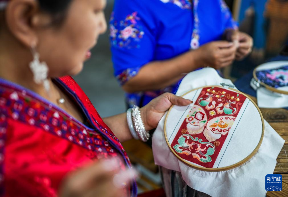 龙禄颖(中)在位于贵州省施秉县的舞水云台非遗工坊进行刺绣创作(10月10日摄)。