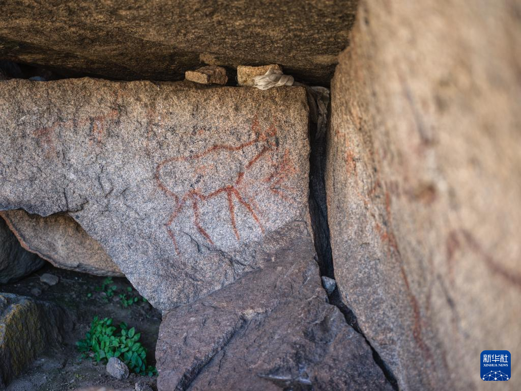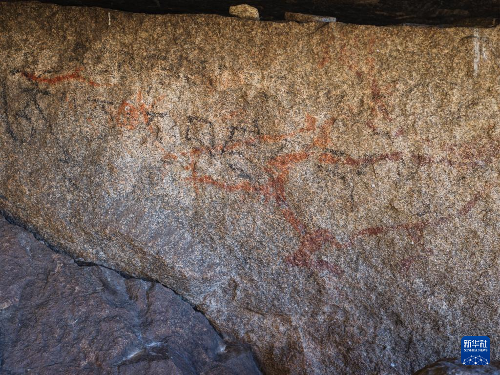 10月21日拍摄的久乃岩画。该岩画由红颜料涂绘的十余幅鹿形图像和若干抽象图案组成。