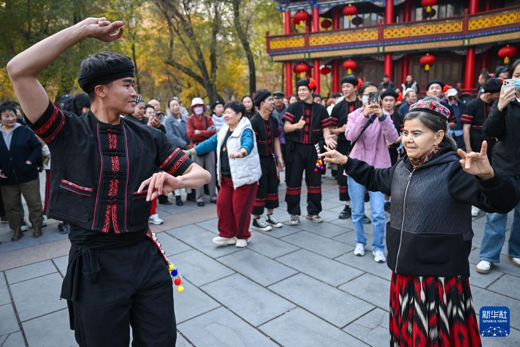 10月27日,在新疆乌鲁木齐市人民公园快闪活动中,舞蹈演员和市民、游客互动。