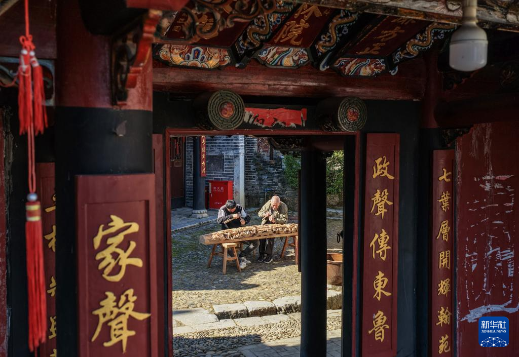 这是11月24日拍摄的刻制中的木雕。汝城木雕是湖南省级非物质文化遗产代表性项目,属传统宗祠营造技艺的重要组成部分。郴州汝城县被誉为“古祠堂之乡”,境内保留着710余座风格各异的古祠堂,木雕在这些古建筑的修缮和保护中发挥着关键作用。