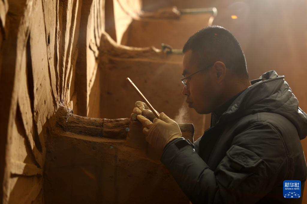 陕西省考古研究院寨沟遗址考古队队员于有光在陕西清涧瓦窑沟墓地M8号墓葬清理车马器(2023年12月5日摄)。