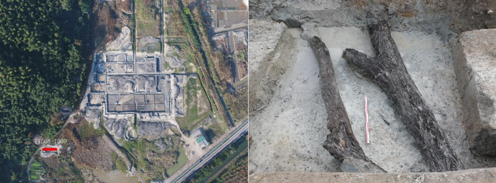施岙遗址位于浙江余姚,考古队员在这里发现了两段并排分布的树木枝干。经测定,出土古树约为公元前2520年,属于良渚文化时期。