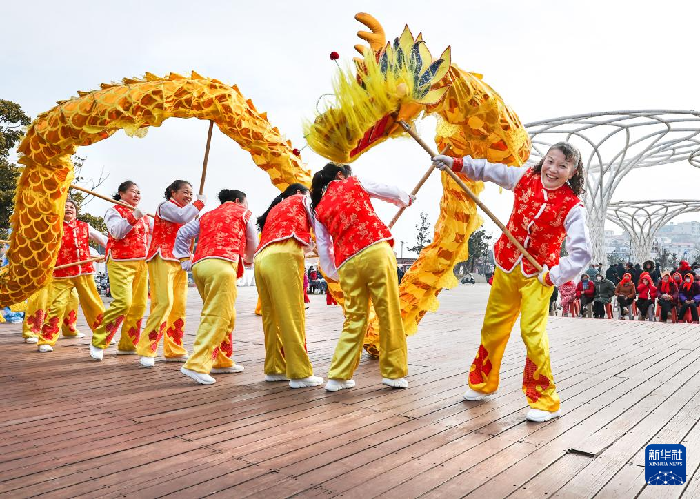 2月10日,民间艺人在江苏省连云港市高公岛街道渔人码头广场表演舞龙。