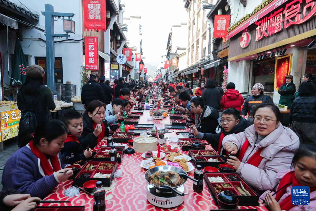 2月11日,一场名为“马上‘宋’福——严州包子宴”的千人长桌宴在浙江省建德市梅城镇严州古城开启,千余名当地群众与各地游客在古街围坐长桌,提前拥抱团圆年味。