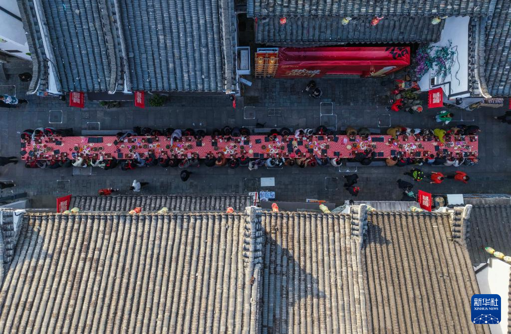 2月11日,当地群众与各地游客在古街围坐长桌,品尝美食(无人机照片)。