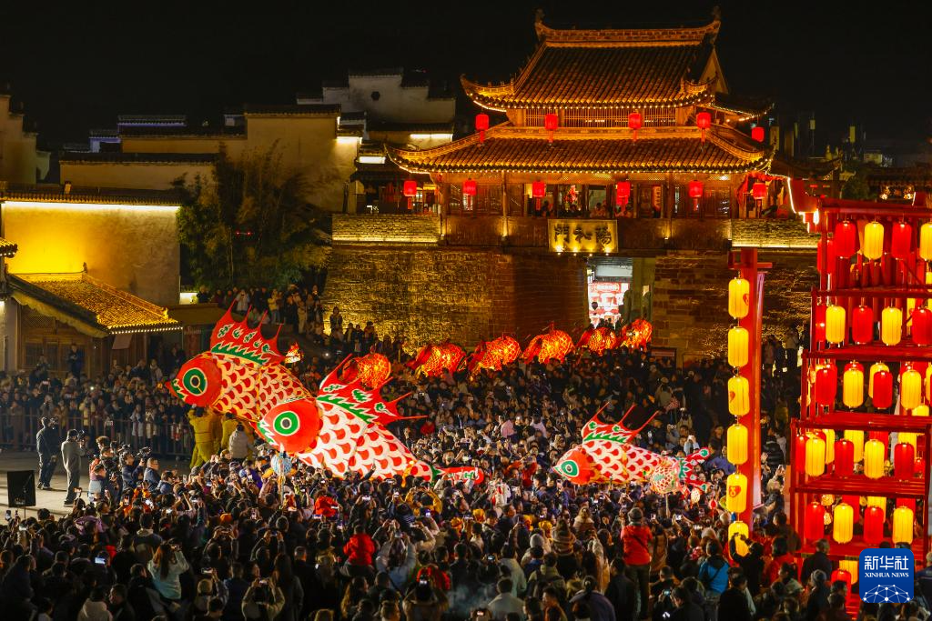 2月4日,在安徽省黄山市歙县徽州古城,人们在观看汪满田村的鱼灯表演队表演。
