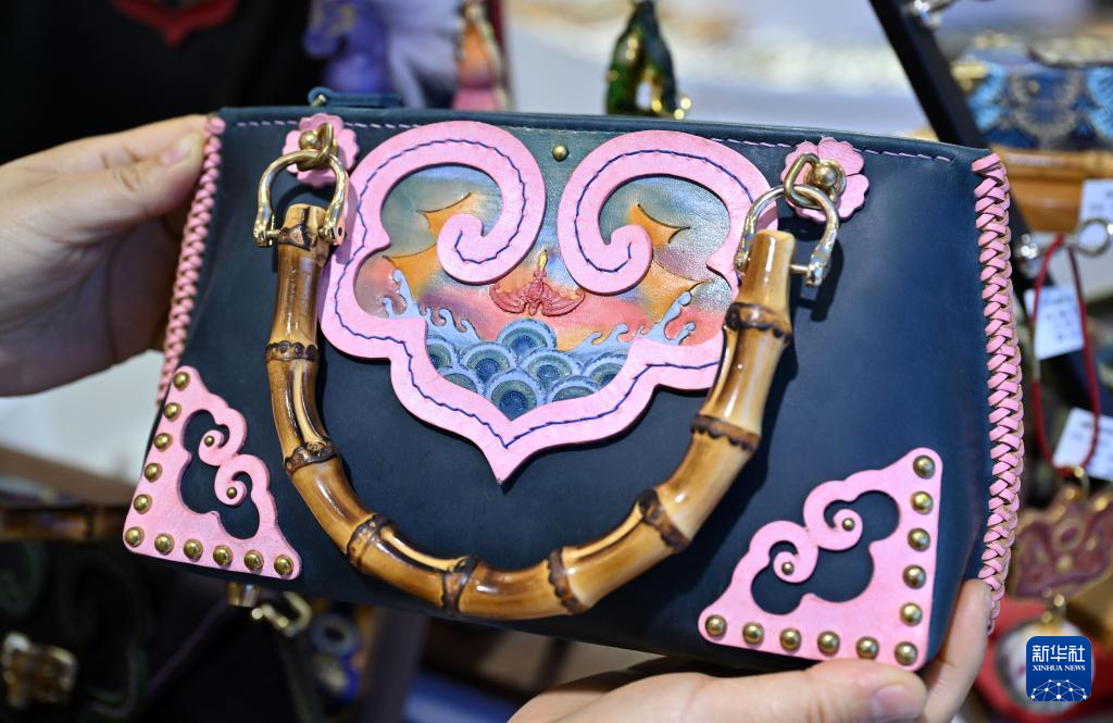 4月15日在第六届消博会现场拍摄的一款非遗皮雕手提包。