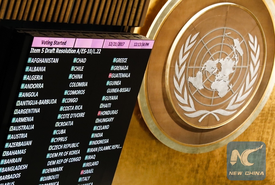 Photo taken on Dec. 21, 2017 shows the voting of a United Nations General Assembly resolution on the status of Jerusalem during a rare emergency special session at the UN headquarters in New York. (Xinhua/Wang Ying)