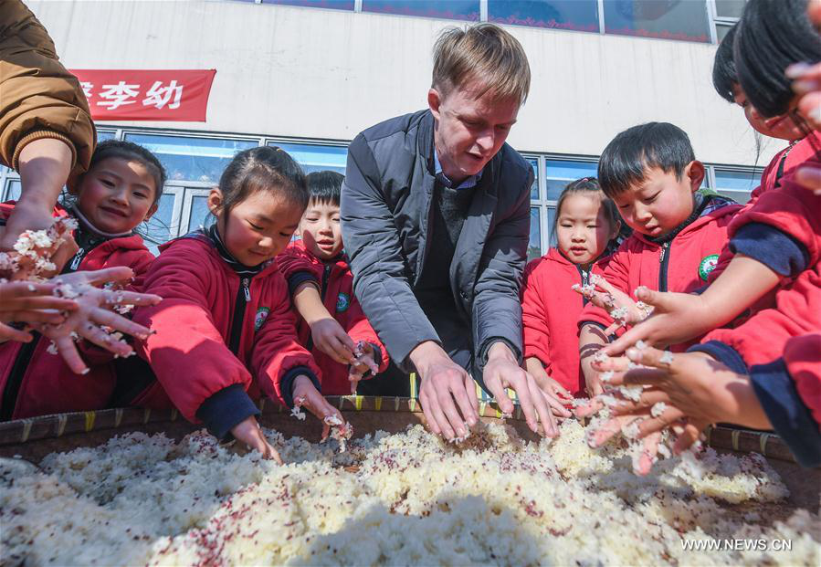 An American teacher and children experience the process of traditional rice wine making to celebrate the upcoming Winter Solstice festival at a kindergarten in Lijiaxiang Township in Changxing County, east China's Zhejiang Province, Dec. 21, 2017. Winter Solstice, the shortest day of the year, falls on Dec. 22 this year. In Chinese culture, it marks the beginning of deep winter and a break from farming in traditional agricultural society. It is also a time for family gatherings. (Xinhua/Xu Yu)