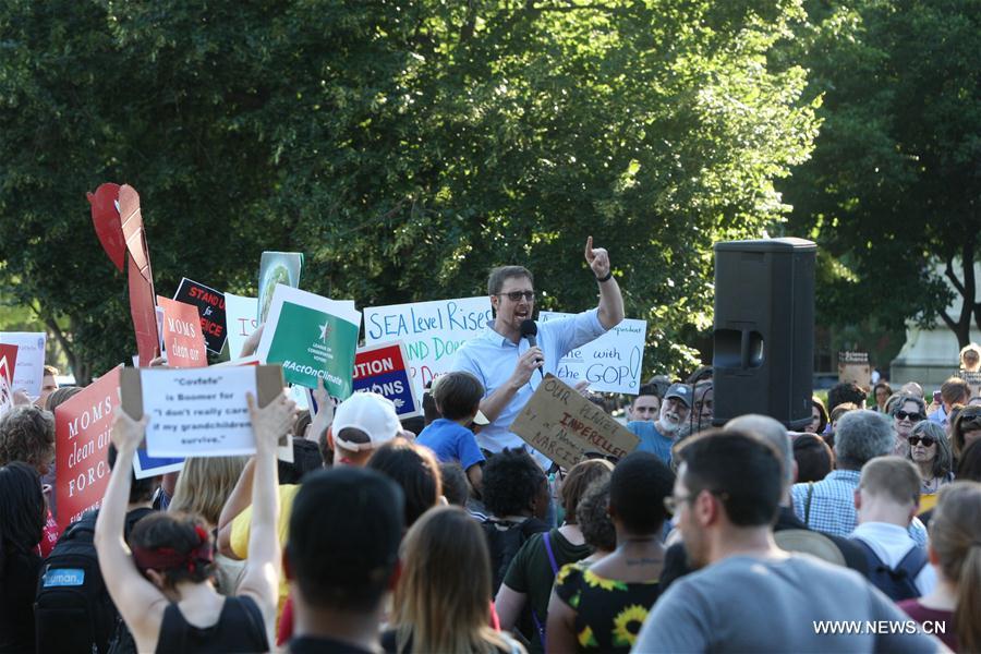 A demonstration is held to protest against U.S. President Donald Trump's decision to withdraw from the Paris Agreement, outside the White House in Washington D.C. June 1, 2017. (Xinhua/Yan Liang)