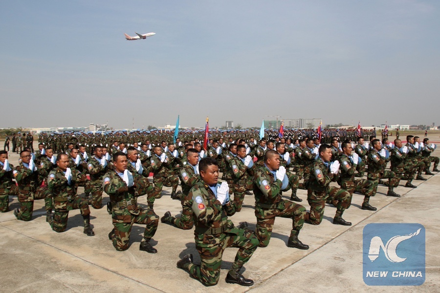 Cambodian troops take an oath of allegiance in Phnom Penh, Cambodia, Jan. 18, 2018. Cambodia sent the eighth batch of 184 peacekeepers to Lebanon to replace the seventh group, whose one-year United Nations peacekeeping mission in that country had come to an end. (Xinhua/Sovannara)