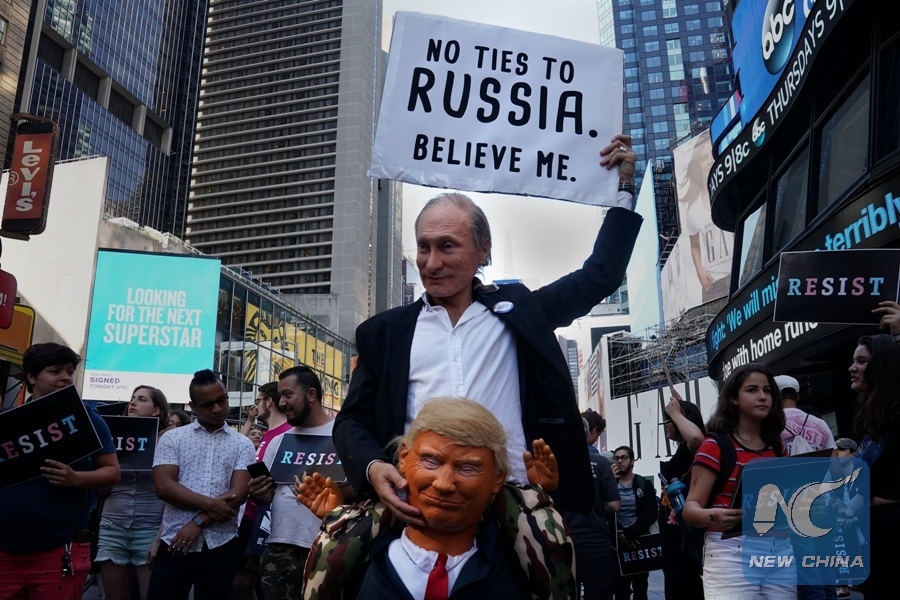 A participant dressed as both Russia's President Vladimir Putin and U.S. President Donald Trump attends a protest against Trump's announcement that he plans to reinstate a ban on transgender individuals from serving in any capacity in the U.S. military, in Times Square, in New York City, New York, U.S., July 26, 2017. (Xinhua/REUTERS)