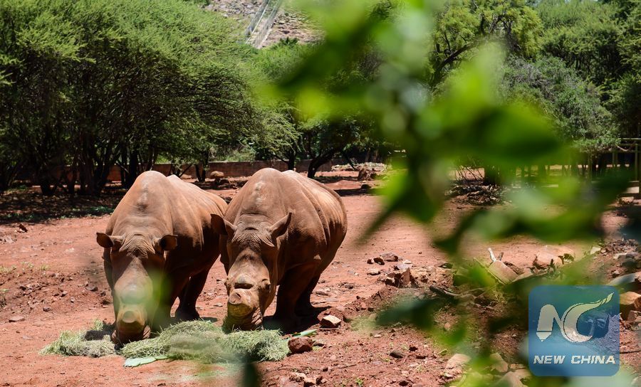 Photo taken on Dec. 3, 2014 shows two of the rhinos adopted by Chinese embassy in South Africa at National Zoological Gardens (NZG), in Pretoria, South Africa. The Chinese embassy adopted five rhinos on Wednesday in NZG of South Africa in Pretoria to protect the endangered wild animals. (Xinhua/Zhai Jianlan)
