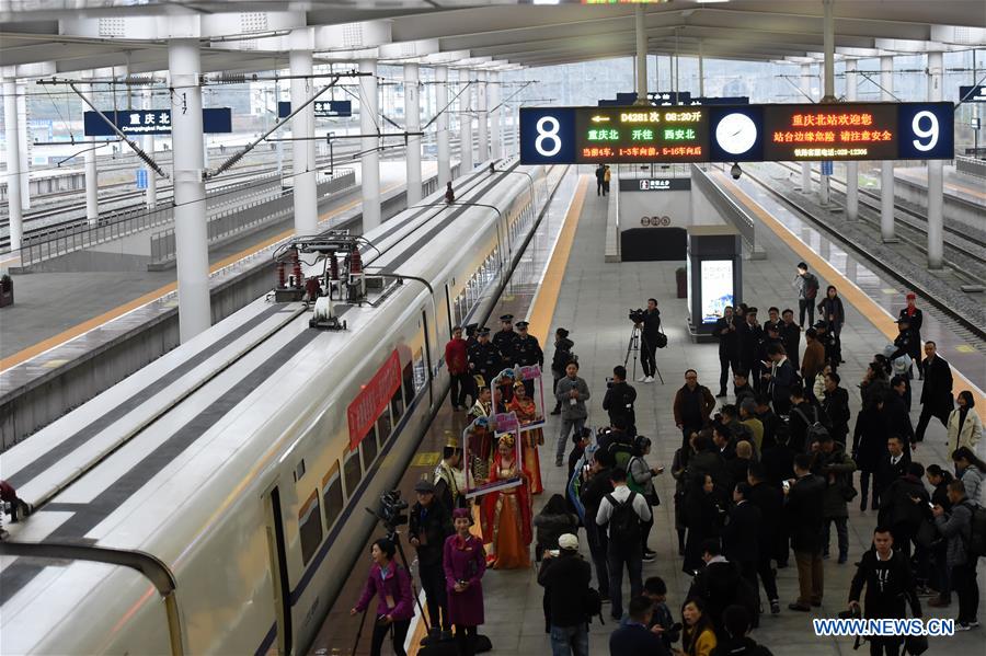 A bullet train prepares to leave for Xi'an, capital of northwest China's Shaanxi Province, at the Chongqingbei Railway Station in southwest China's Chongqing Municipality, Dec. 6, 2017. High-speed trains linking Xi'an and Chongqing, began operation on Wednesday, slashing the travel time between the two cities from 9.5 hours to just 5.5. The new route includes a new section of the high-speed rail line linking Xi'an with Chengdu, capital of southwest China's Sichuan Province, which also started operation on Wednesday. (Xinhua/Tang Yi)