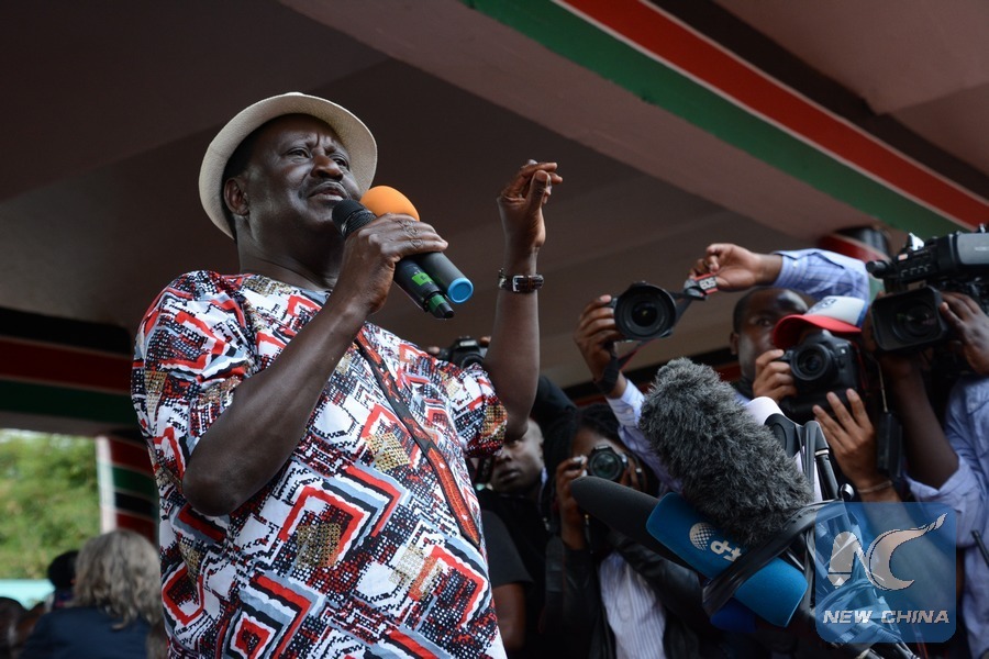 File photo shows National Super Alliance (NASA) leader Raila Odinga address his supporters at Uhuru Park in Nairobi, capital of Kenya, Oct. 25, 2017. (Xinhua/Nyalwash)