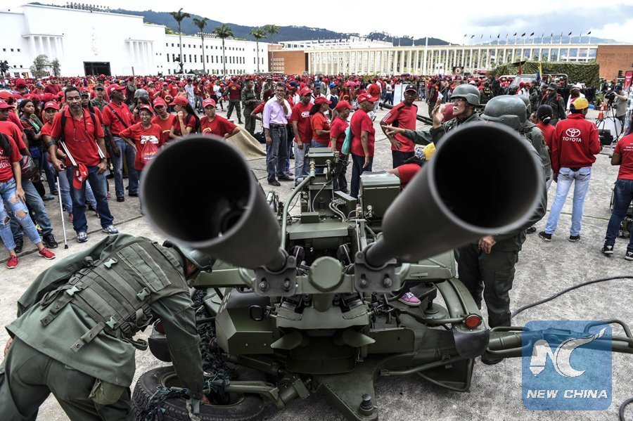 Members of the national army show locals how to handle an antiaircraft battery during military drills in Caracas on Aug. 26, 2017. Venezuela kicks off two days of military drills in response to U.S. President Donald Trump's threat of military action and newly announced sanctions on the nation. (Xinhua/AFP)