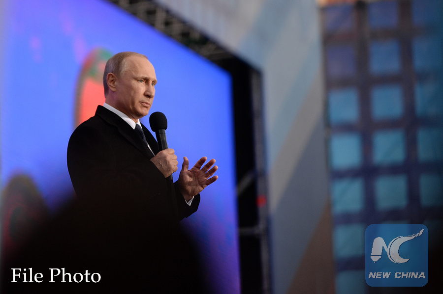 Russian President Vladimir Putin speaks at a celebration to mark the first anniversary of Crimea's incorporation into Russia, in Moscow, Russia, March 18, 2015. (Xinhua Photo)