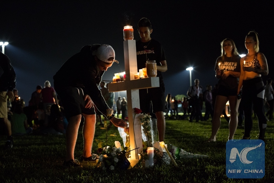 People attend a vigil for the victims of the shooting at Marjory Stoneman Douglas High School, in Pine Trails Park in Parkland, Florida, the United States, on Feb. 15, 2018. (Xinhua/Monica McGivern)
