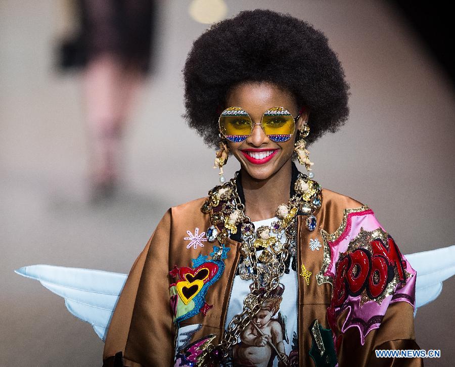 A model presents a creation of Dolce&Gabbana "Fashion Devotion" Autumn/Winter?18/19 women's collection during Milan Fashion Week in Milan, Italy, Feb. 25, 2018. (Xinhua/Jin Yu)