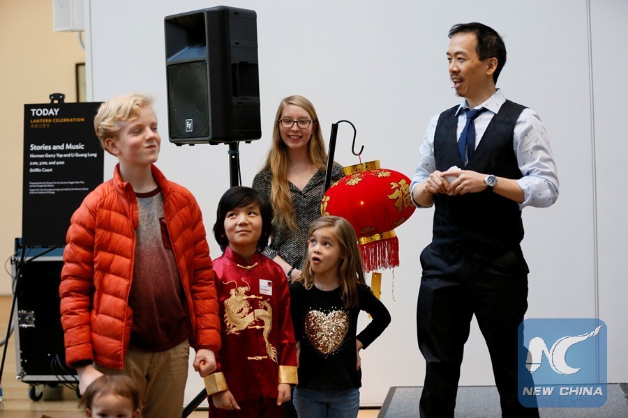 A Chinese artist interacts with young children with Chinese story telling at Art Institute of Chicago, the United States, on March 3, 2018. (Xinhua/Wang Ping)