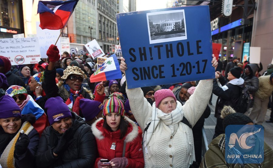 Protesters carry signs during a march on Martin Luther King Jr. Day in Times Square, called Rally Against Racism: Stand Up for Haiti and Africa in New York Jan. 15, 2018. Americans remembered civil rights hero Martin Luther King on his holiday Monday, a day after U.S. President Donald Trump vehemently denied he is a racist amid an uproar over a reported presidential slur. (Xinhua/AFP)