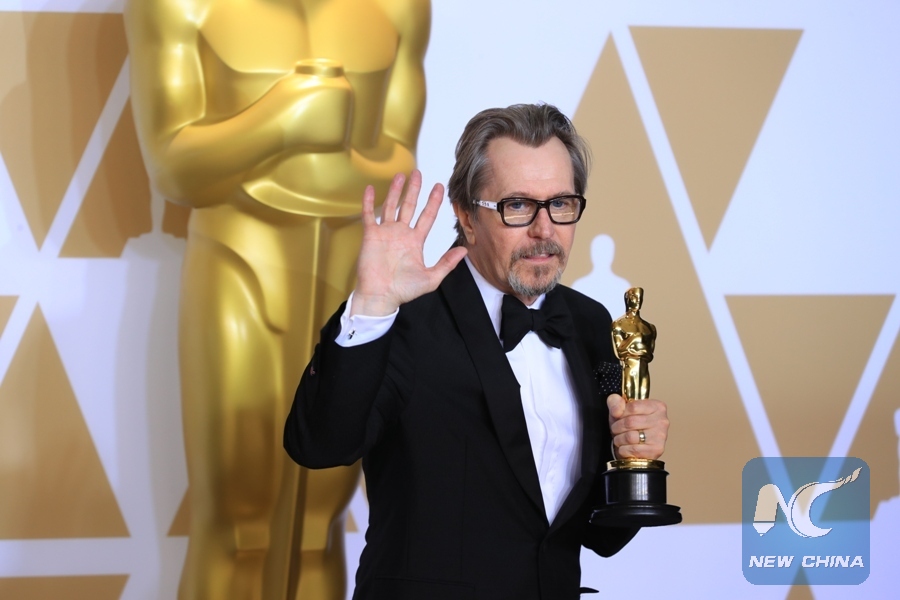 Actor Gary Oldman poses after winning the best ACTOR IN A LEADING ROLE award for "Darkest Hour" at press room of the 90th Academy Awards at the Dolby Theater in Los Angeles, the United States, on March 4, 2018. (Xinhua/Li Ying)