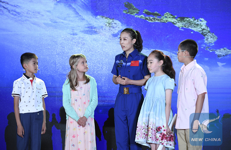 Wang Yaping (C) talks with children during an event on the 2017 Global Space Exploration Conference in Beijing on June 6, 2017. (Xinhua/Zhang Ling)